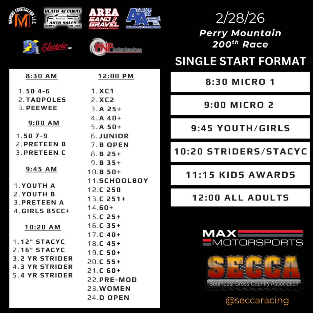 Registration: All racers must bring their helmet to signup. Online Registration is open to members who already have a properly working transponder. Please double check your helmet sticker and make sure you only have your SECCA # on the left side of the helmet (We have seen some helmets with wrong stickers or multiple numbers on the side.) On race day we will have it separated by Pre-Entry and Race Day Sign up. If you register online you do not need to fill out another paper at the race and your name will be on the waiver at the Pre-Entry table. Be sure to complete the online entry and receive your confirmation email. Bring your helmet to signup to show you have a transponder and proper sticker. If time allows we will open up Friday evening for registration as well.