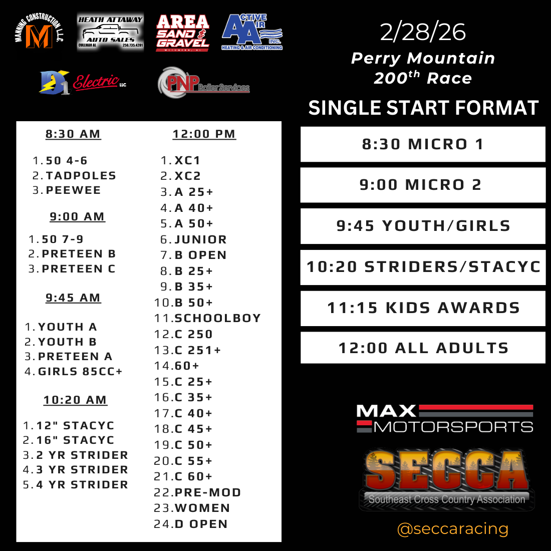 Awards: Top 5 to Kids, Girls, Schoolboy, Junior, and 250 C. All other classes are top 3.